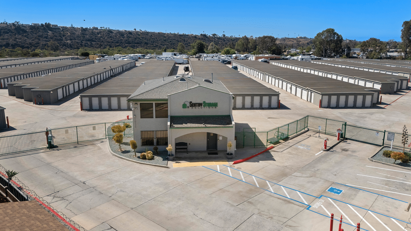 An aerial view of a Secure Storage facility shows rows of beige storage units, a two-story office at the entrance, and gated access with paved driveways.